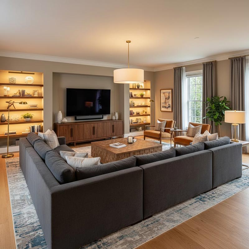 چیدمان مبل هفت نفره با تلویزیون باید به گونهای باشد که تمام افراد دید مناسب داشته باشند. فاصله مناسب بین مبل و تلویزیون باعث کاهش خستگی چشم میشود. زاویه قرارگیری مبل باید هم راحت باشد و هم دید کامل به تلویزیون بدهد. استفاده از مبلهای با پشتی قابل تنظیم، تجربه بهتری ایجاد میکند. صندلیهای مکمل یا پافها برای مهمانان اضافی مناسب هستند. نورپردازی محیط نباید باعث بازتاب روی صفحه تلویزیون شود. ترکیب رنگ مبل و دکور باعث هماهنگی بصری میشود. میز جلو مبل برای قرار دادن وسایل ضروری کاربرد دارد. انتخاب فرش مناسب، تمرکز بصری را افزایش میدهد. رعایت اصول فاصله و زاویه، تجربه تماشای تلویزیون را بهینه میکند.
