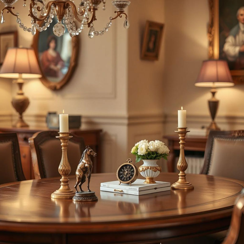 برای میز کنسول ورودی خانه، ترکیب یک آینهی بزرگ قابدار با شمعدانهای طلایی و یک گلدان دکوری میتواند ترکیبی چشمنواز بسازد. در اتاق پذیرایی، از مجسمههای کلاسیک، ساعت دیواری سلطنتی یا تابلوهای هنری برای ایجاد نقطهی تمرکز استفاده کنید.