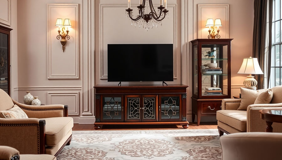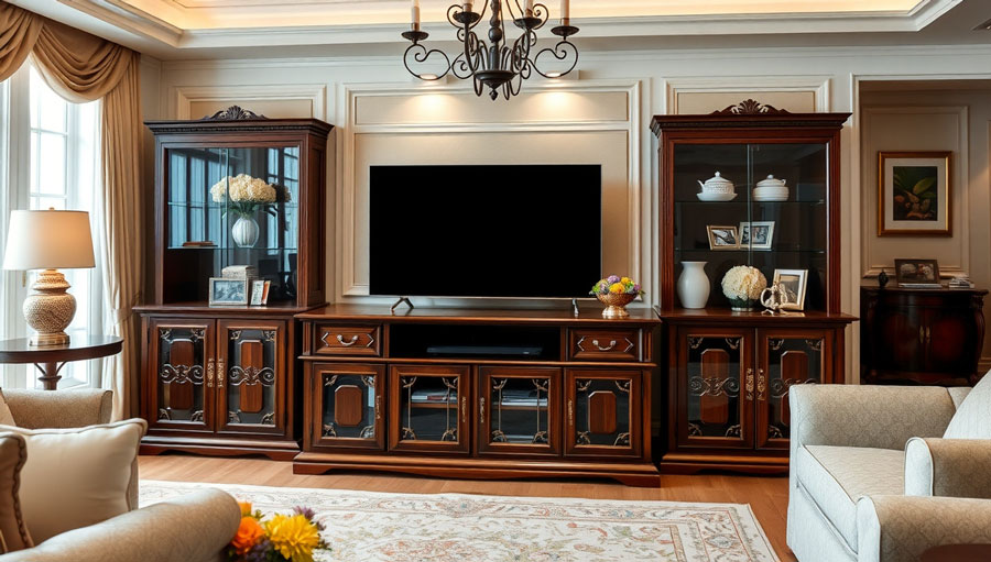 میز تلویزیون کلاسیک با طراحیهای پیچیده و استفاده از متریالهای طبیعی همچنان در دکوراسیونهای مدرن جذاب است. وقتی این میزها با طراحیهای مینیمالیستی یا نئوکلاسیک ترکیب میشوند، میتوانند جلوهای شیک و متفاوت ایجاد کنند. میز تلویزیونهای کلاسیک جدید معمولاً از چوبهای طبیعی با رنگهای تیره یا طلایی ساخته میشوند که میتوانند به راحتی با دکوراسیونهای مدرن که بیشتر از رنگهای خنثی و روشن استفاده میکنند، هماهنگ شوند.